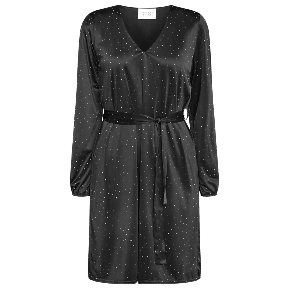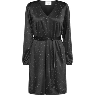 Sort kjole med små stud i sølv, belte i livet og v hals.