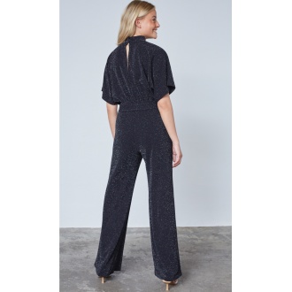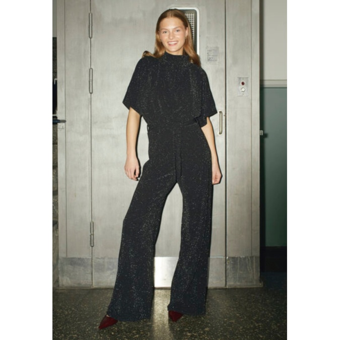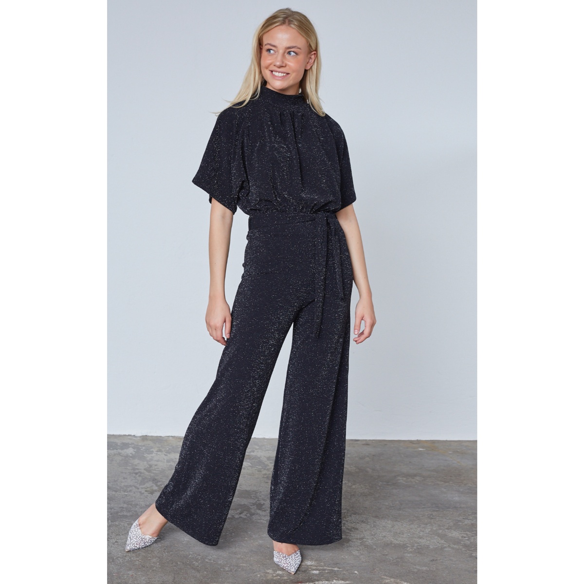 Jumpsuit i sort sølvlurex med knyting i livet.