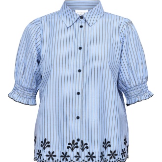 Blusen har knapper hele veien og smock ved ermene og brodert kan nederst.