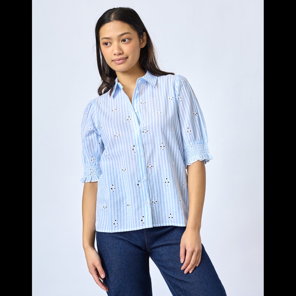 Søteste bluse i 100% bomull med smått hullmønster og maritime striper.