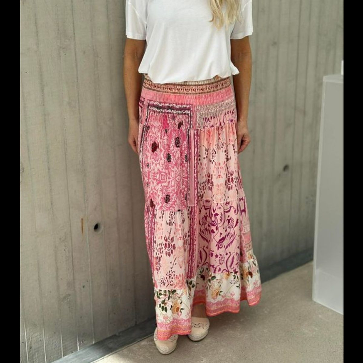 Maxiskjørt med bredt strikk i livet og sommerlig print. Kan også brukes som kjole. 100% viscose Normal i størrelsen.