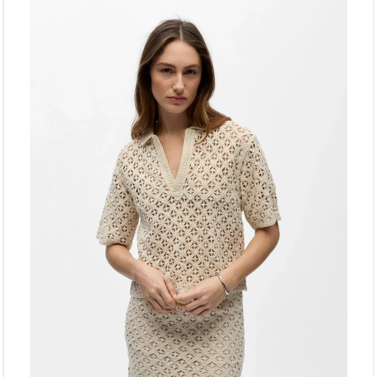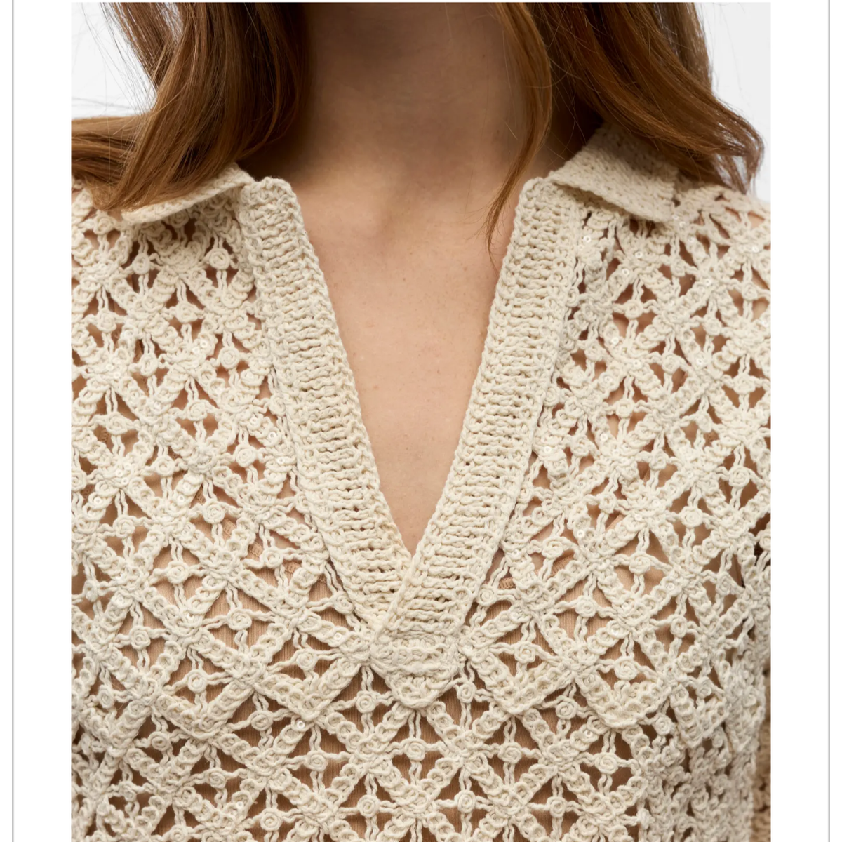 Lekker hekletopp med v hals i 100% bomull Normal i størrelsen.