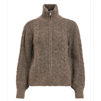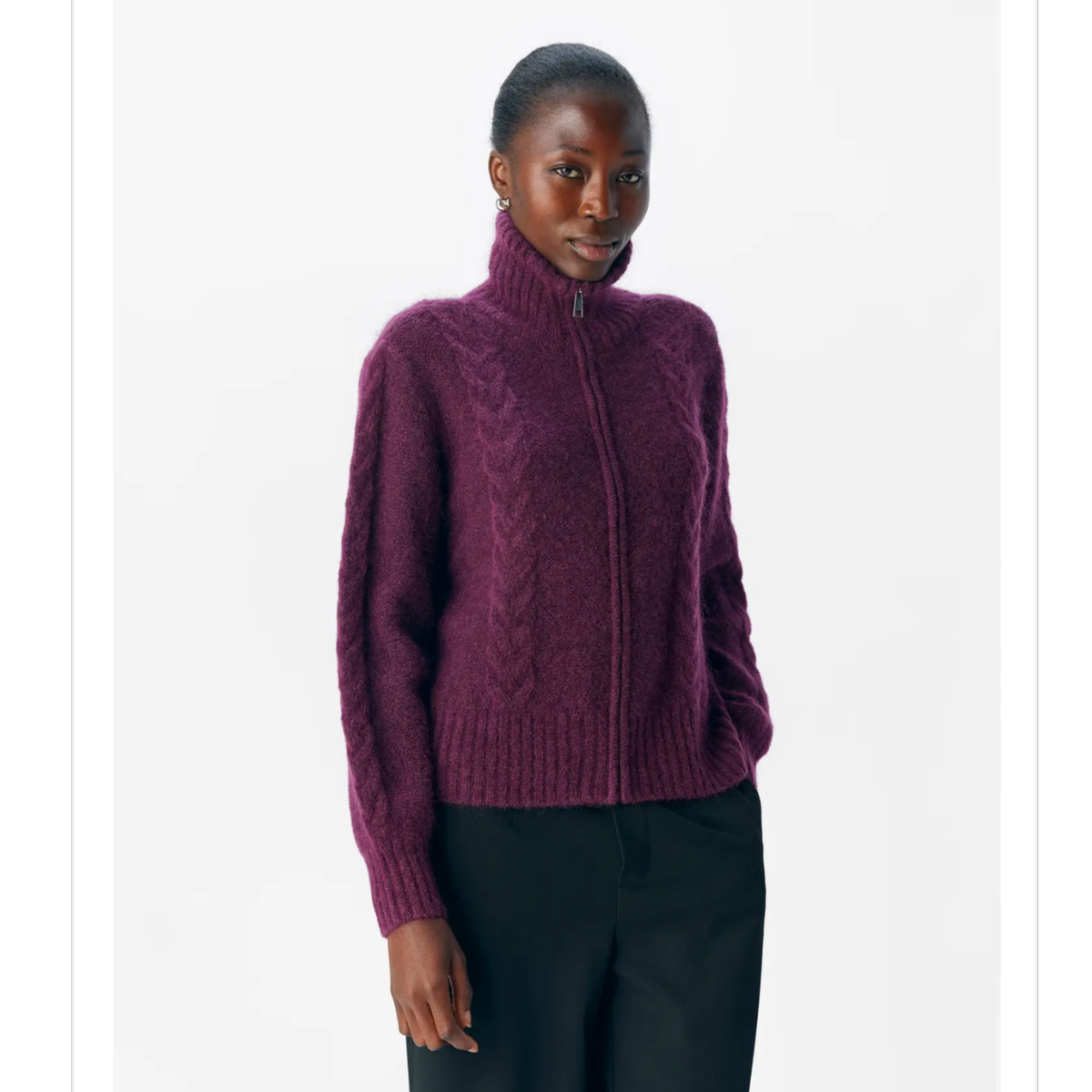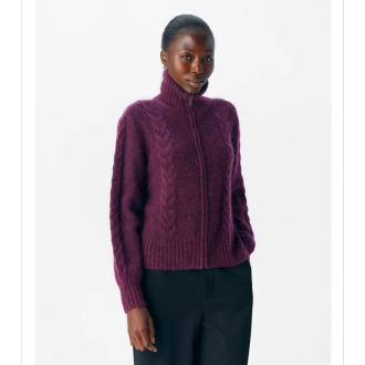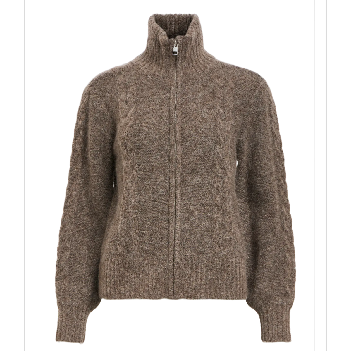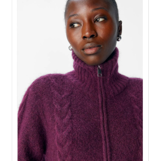Zip foran, høy hals og lekker kabelstrikk.