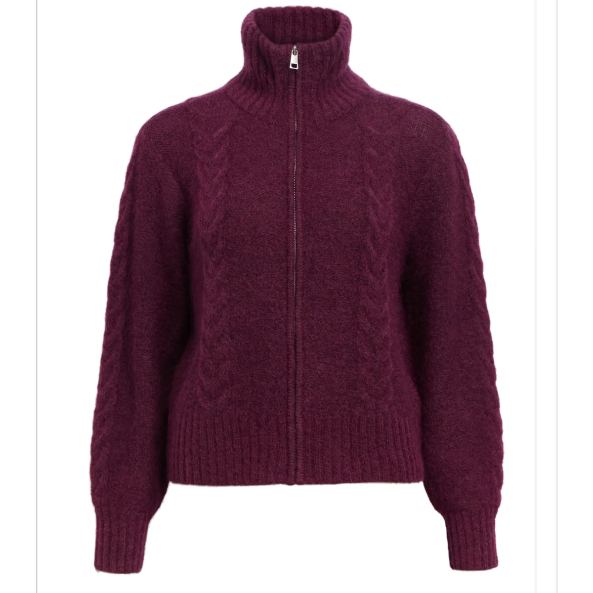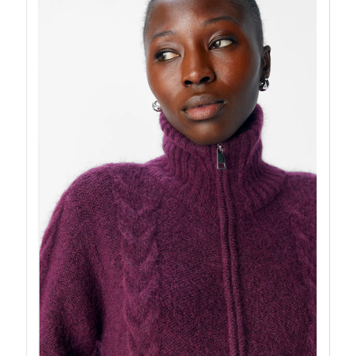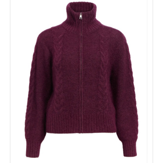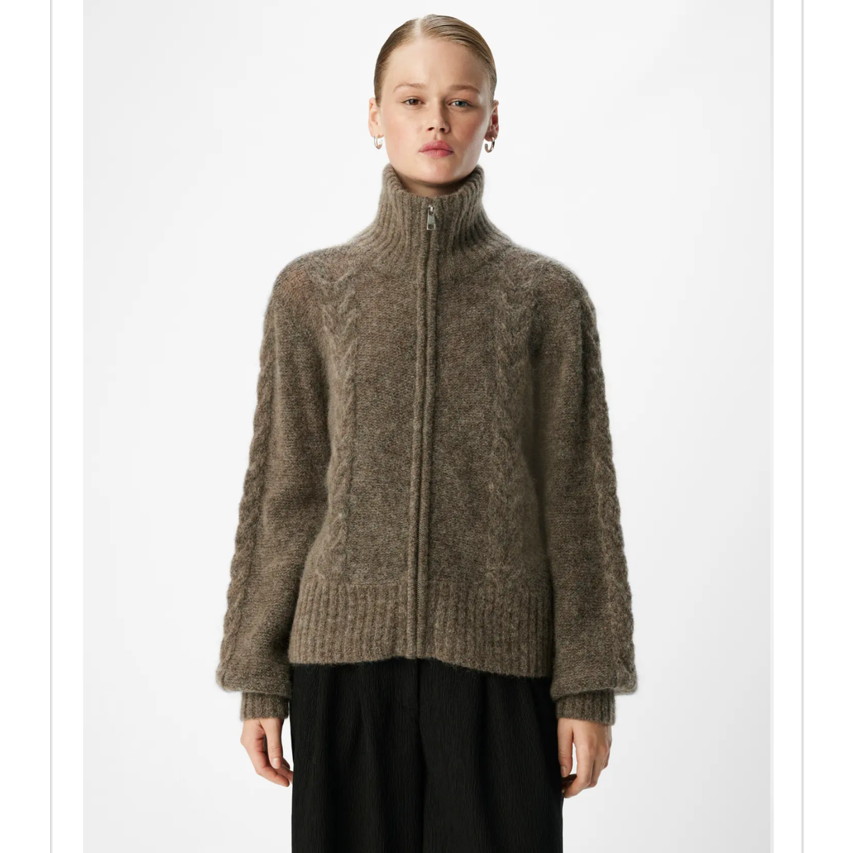 Zip foran, høy hals og lekker kabelstrikk.