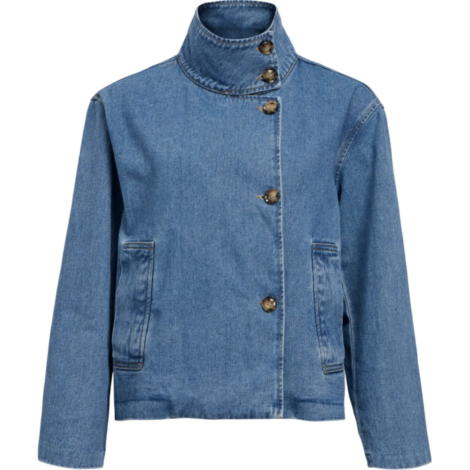 Denimjakke i denne trend modellen vi ser i motebildet, med kraven opp. Skrå knapping og perfekt denimfarge. Normal i størrelsen.