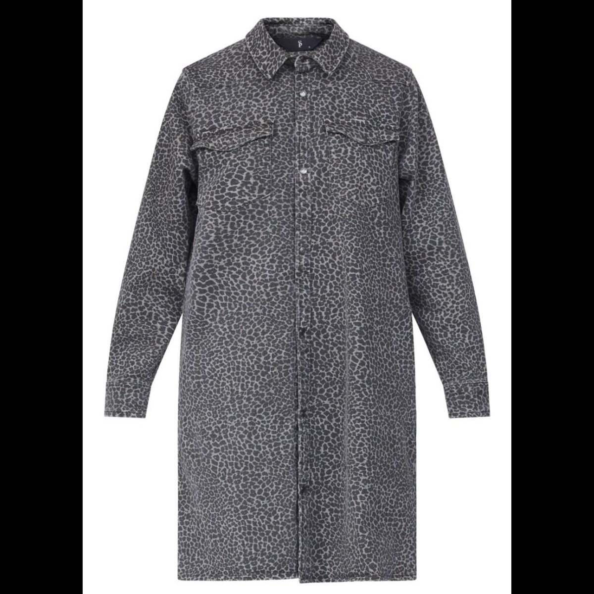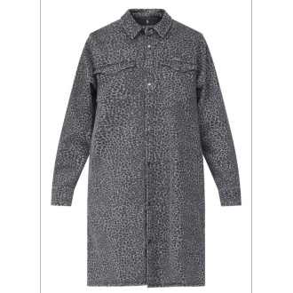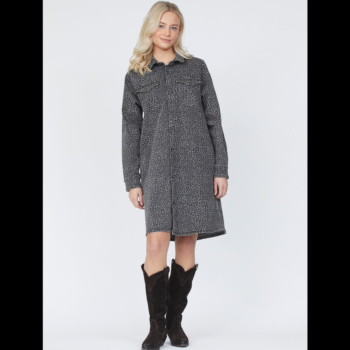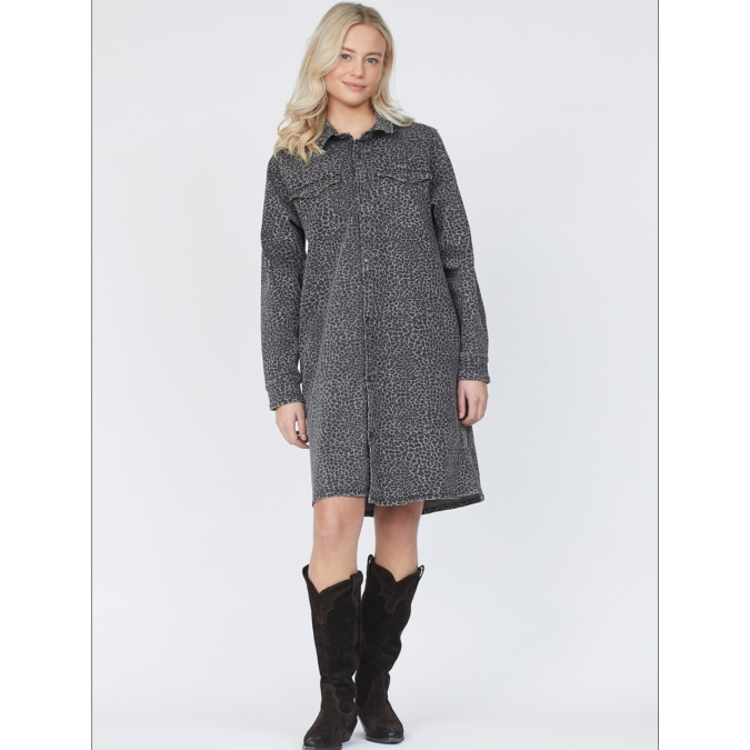 Tøff denimkjole i grått dyreprint med lommer i siden.