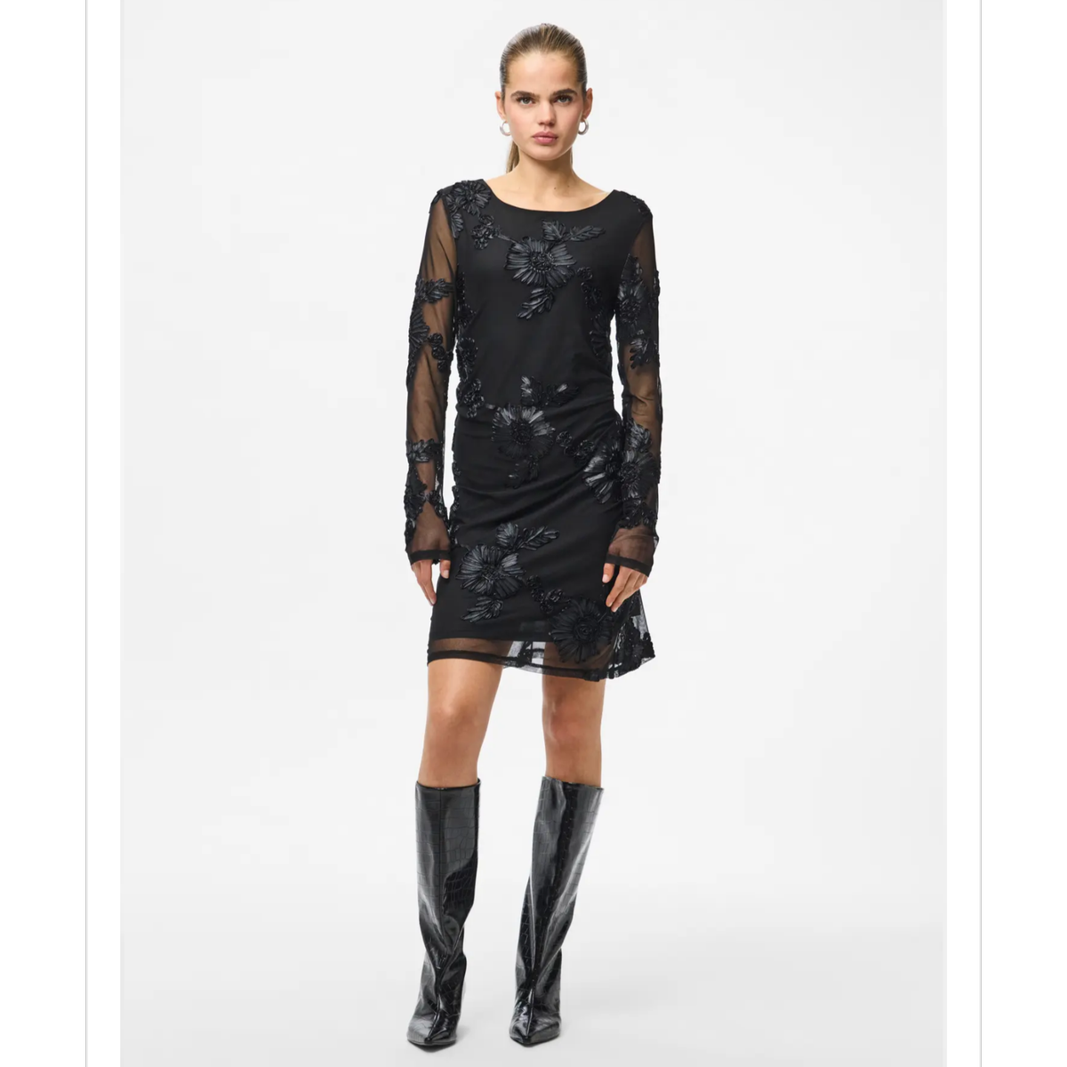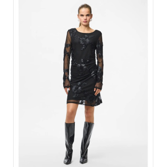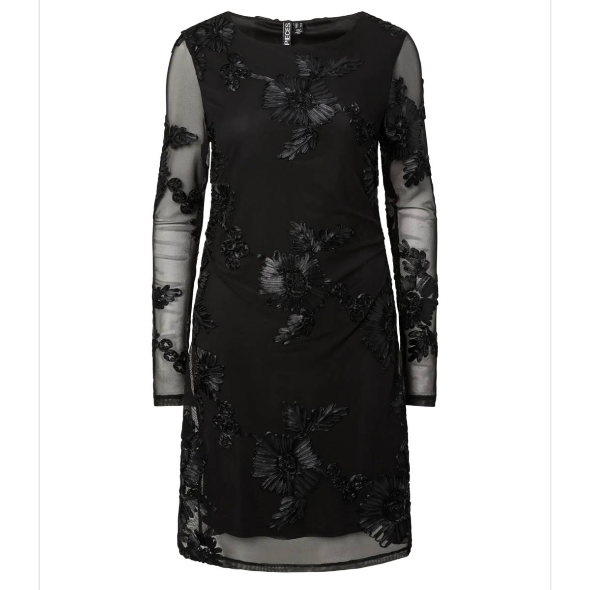 Sort kjole med 3D blomstertrykk og gjennomsiktige ermer. Normal i størrelsen.
