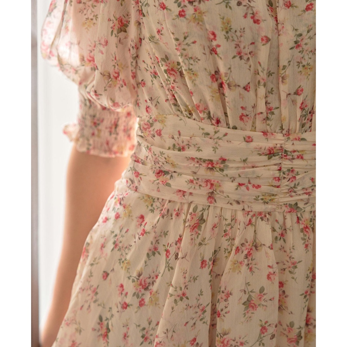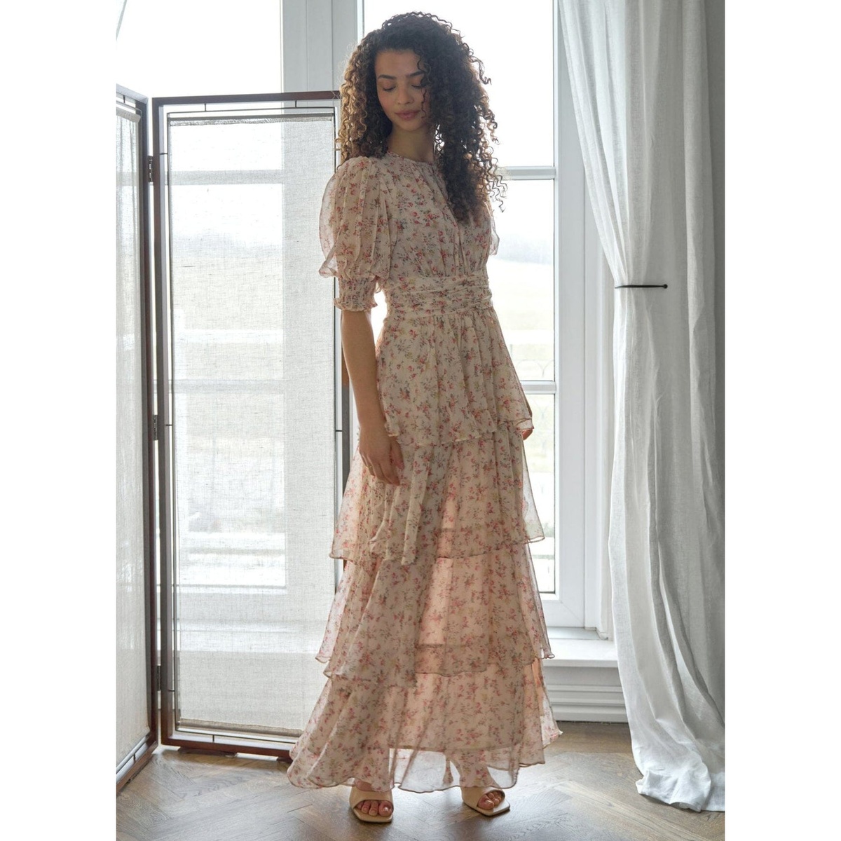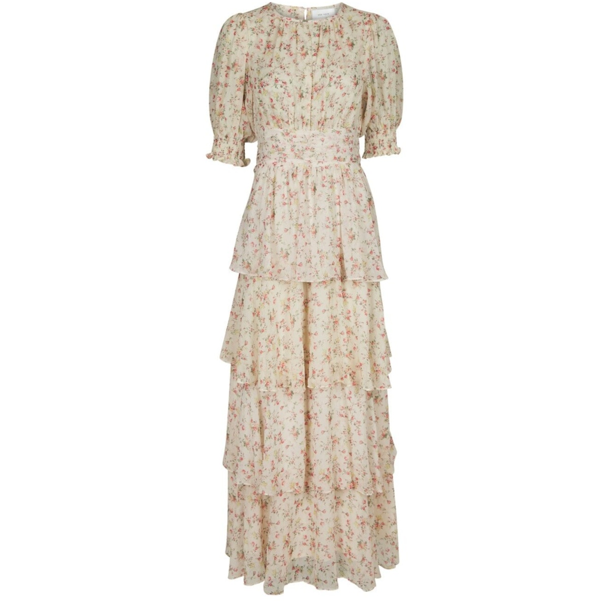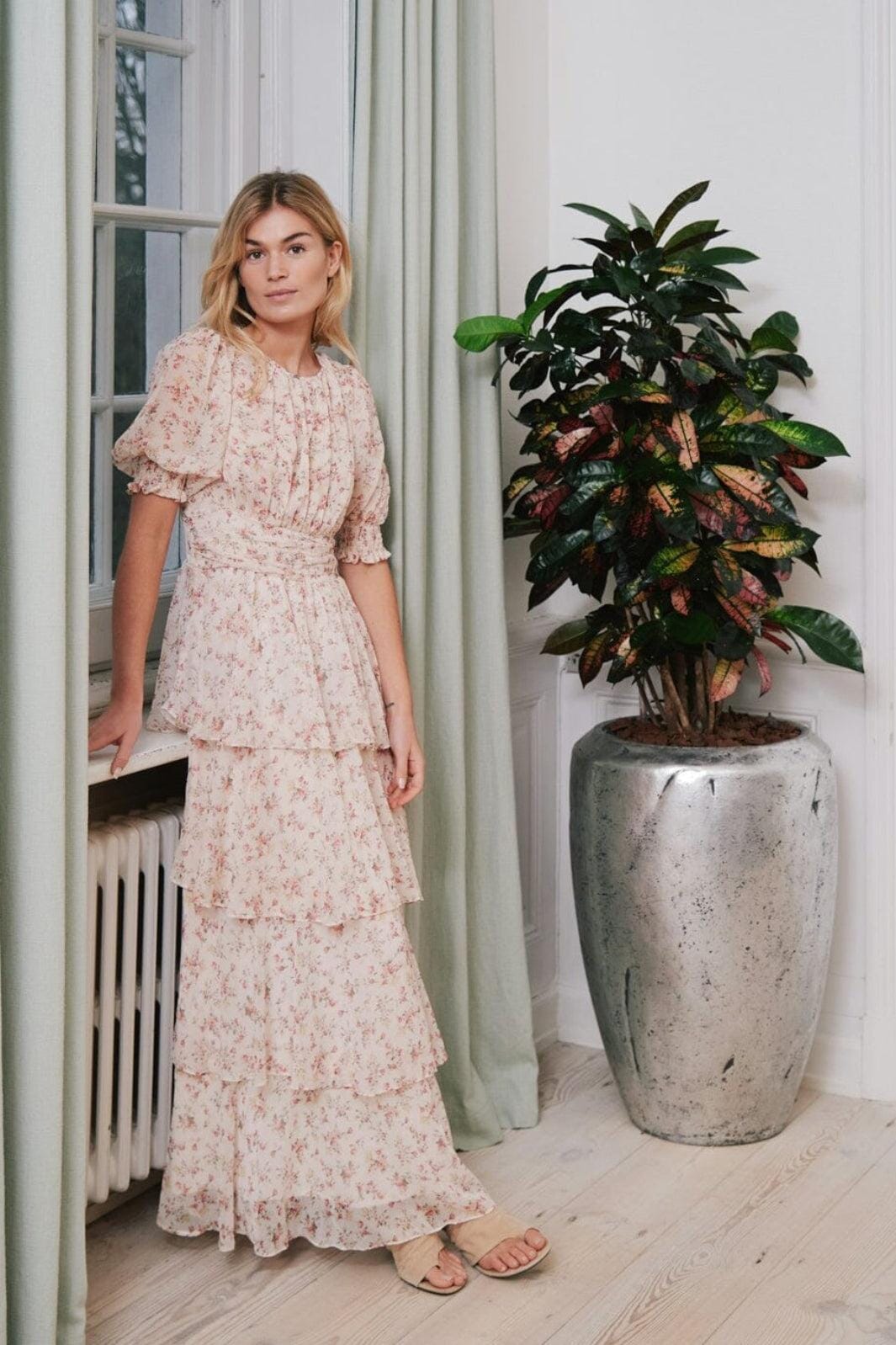 Romantisk lang kjole fra Neo noir med søte små blomster. Kort erm med puff og strikk bak i ryggen. Normal i størrelsen.