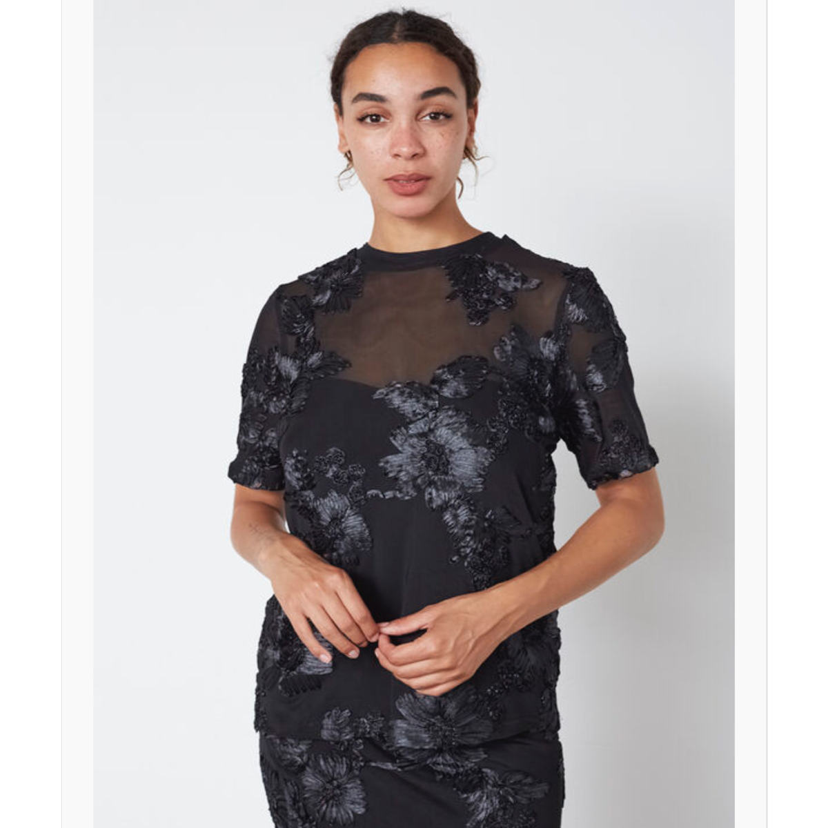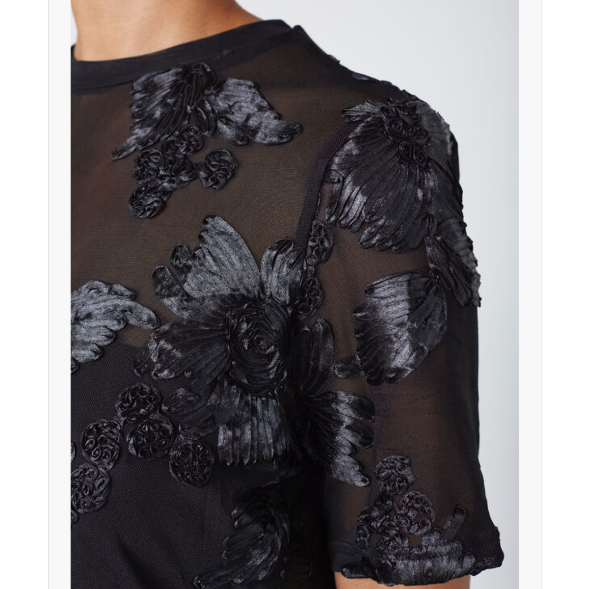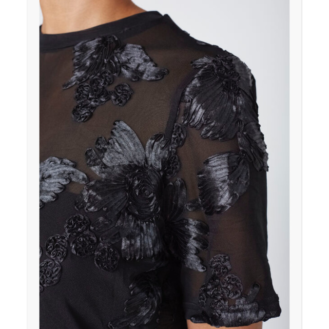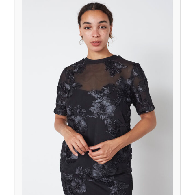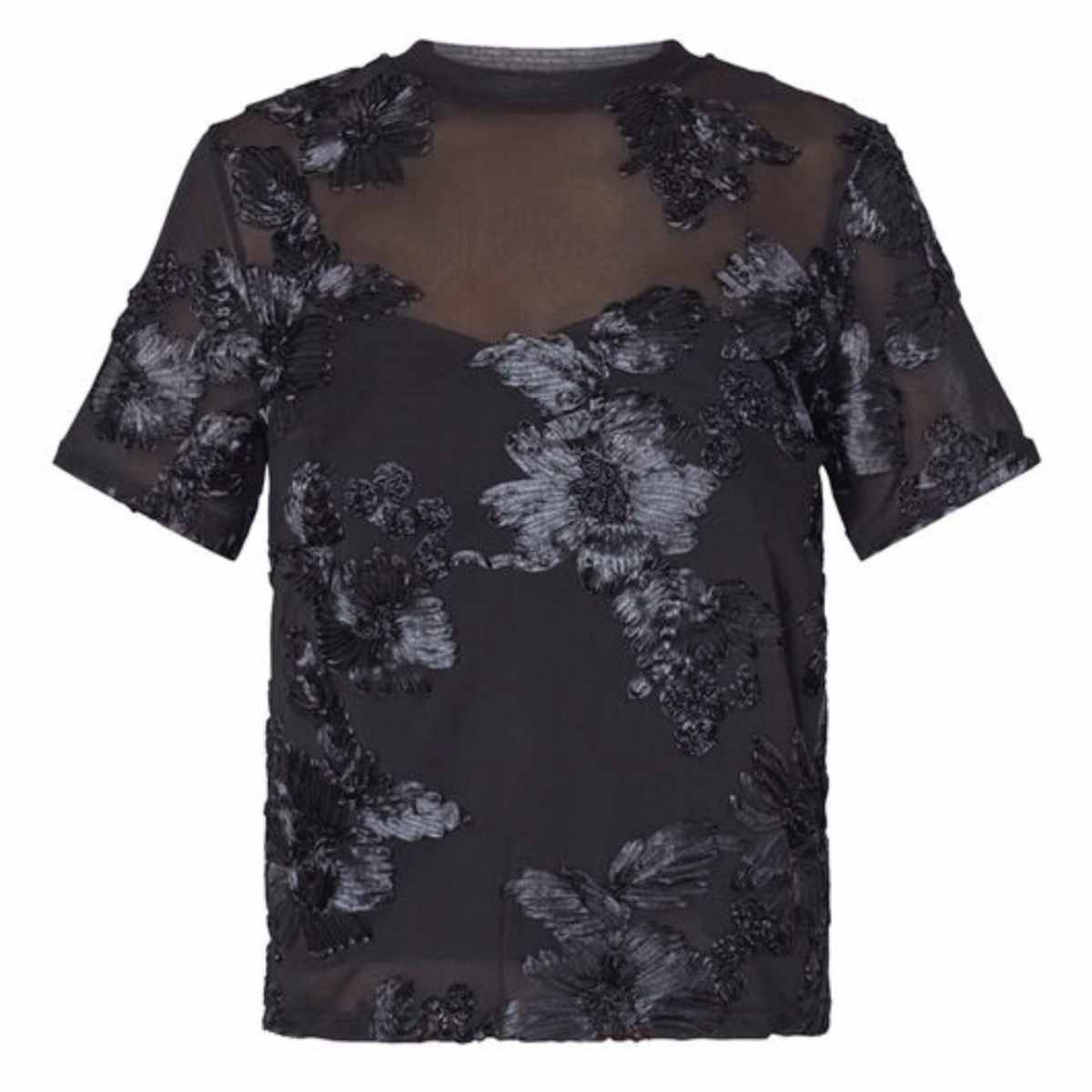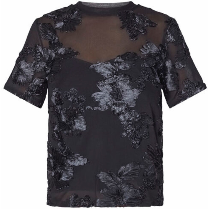 Gjennomsiktig topp med 3d blomster som er så populært nå.