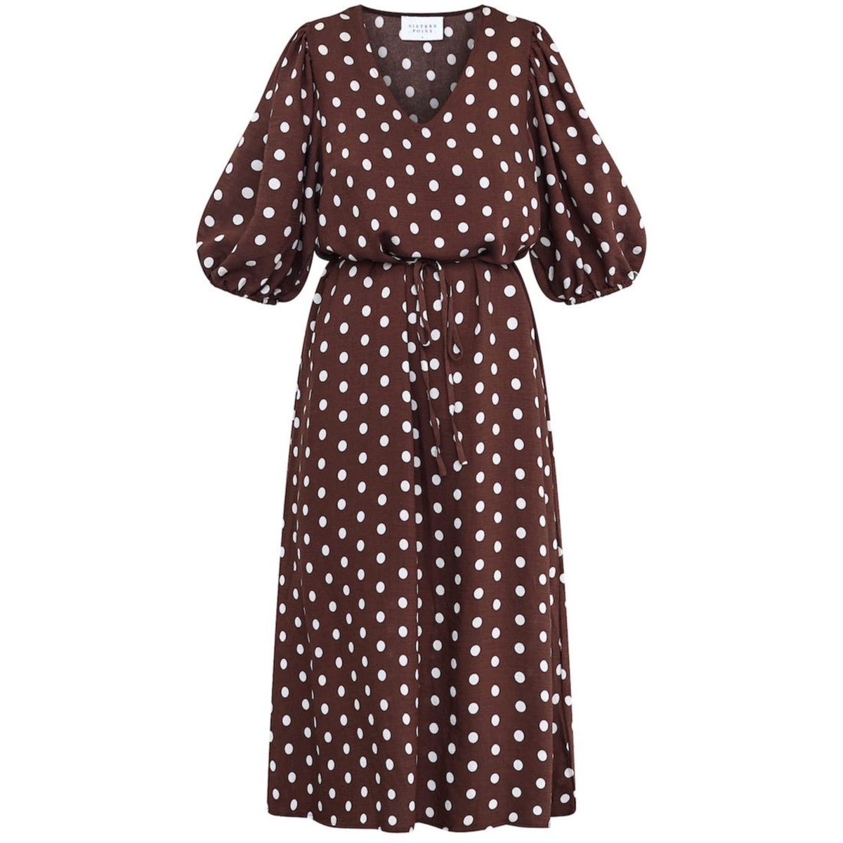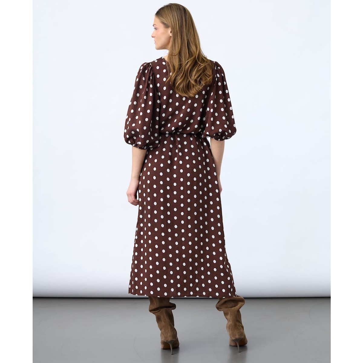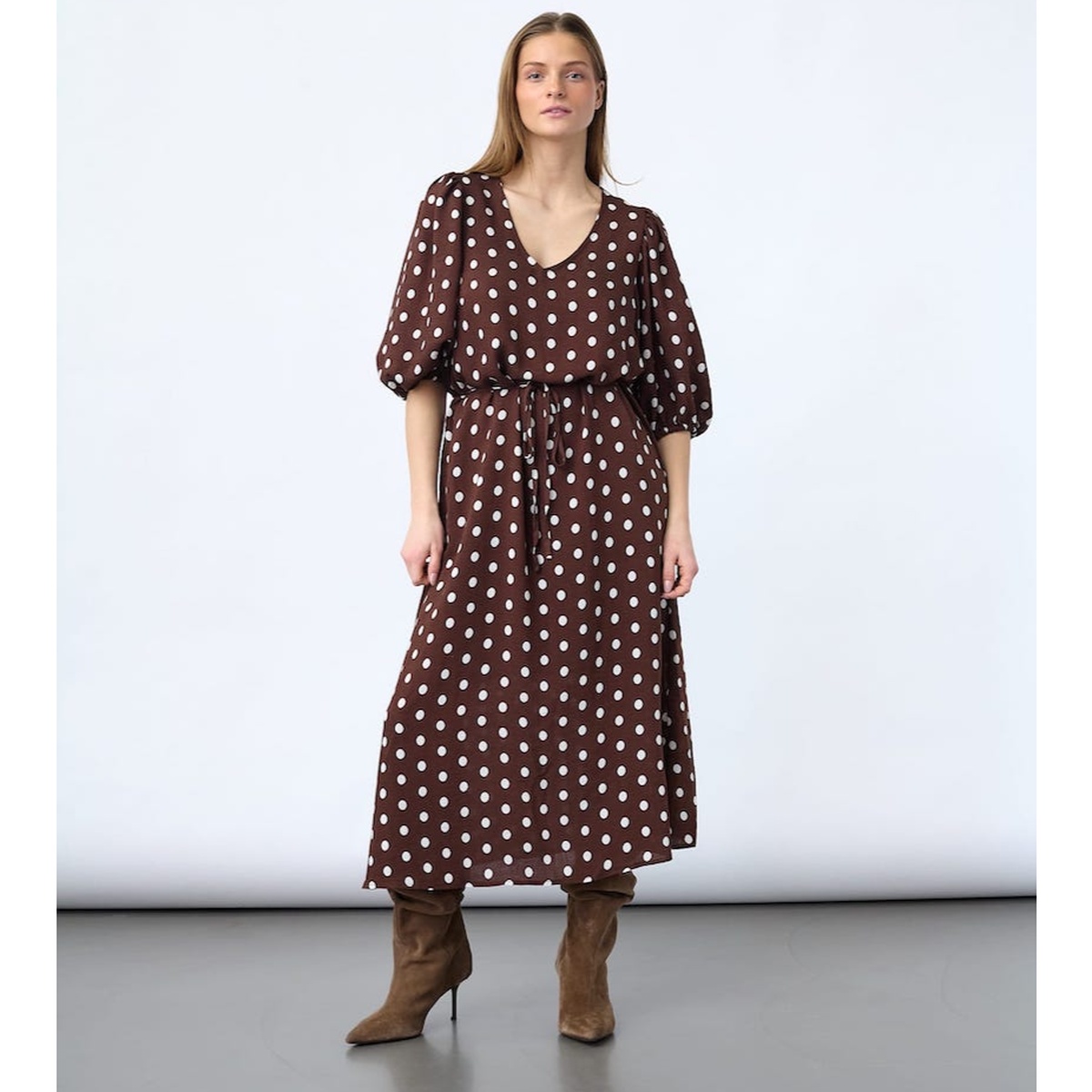 Brun kjole med prikker, perfekt erm og belte i livet.