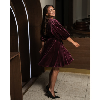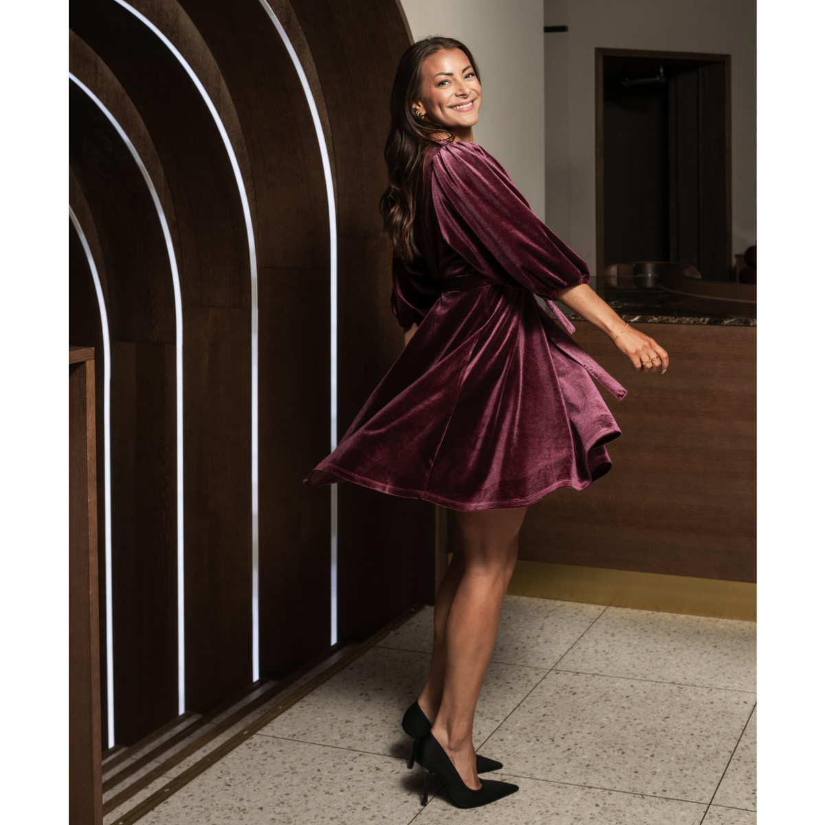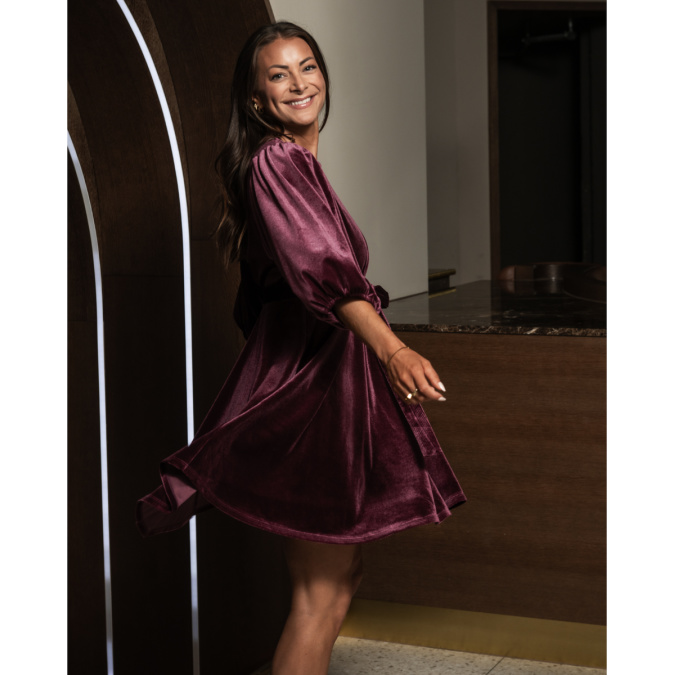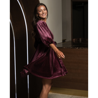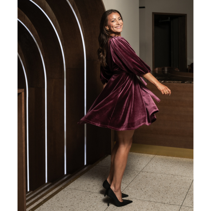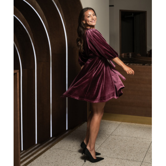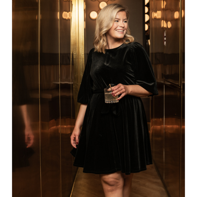 Lekker kort fløyelskjole med knyting i livet.