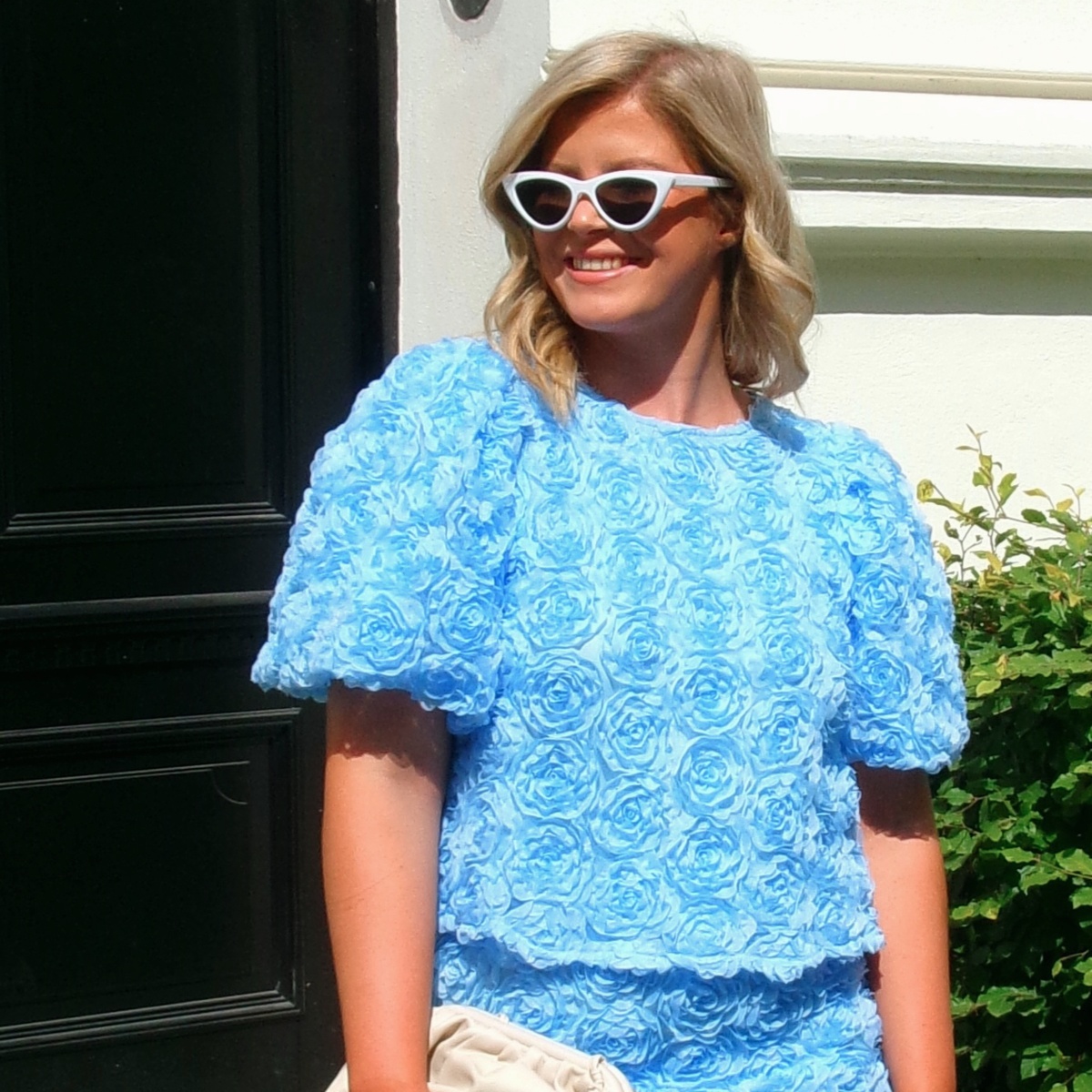 Se på denne fargen!! Rålekker topp med små rosetter over hele, og pufferm.