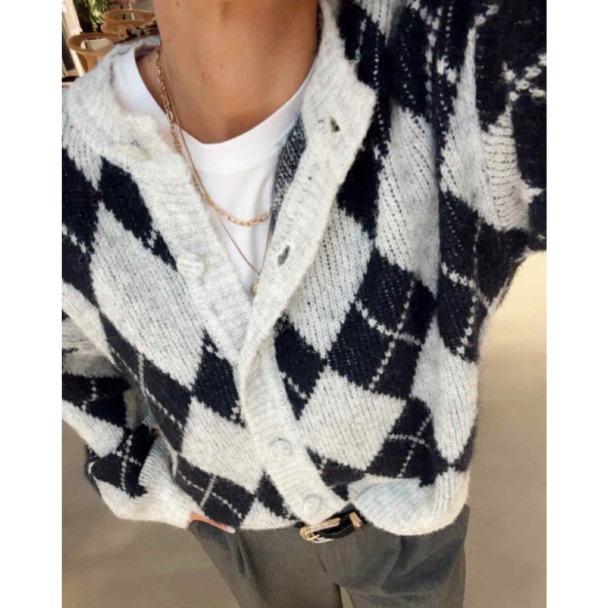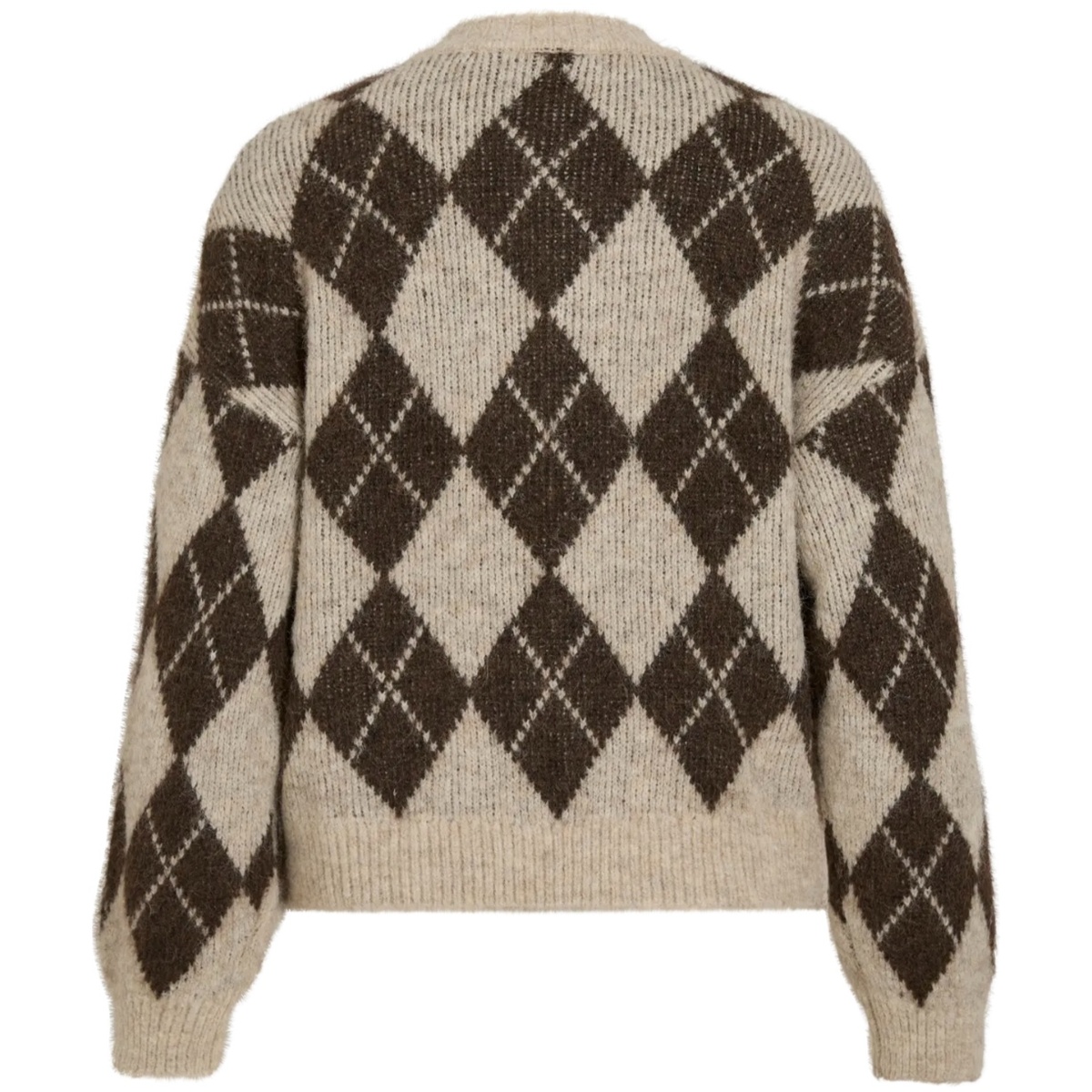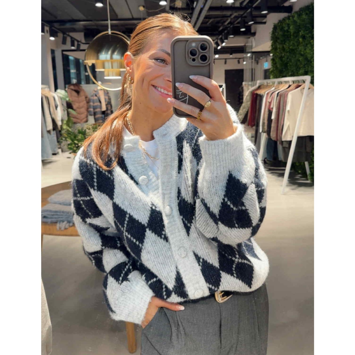 Lekker strikkejakke med trekte knapper og rund hals.