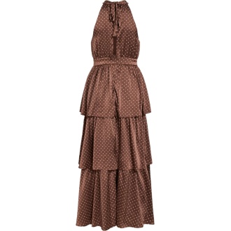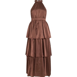 Brun satengkjole med prikker, halterneck og volanger på skjørtet.