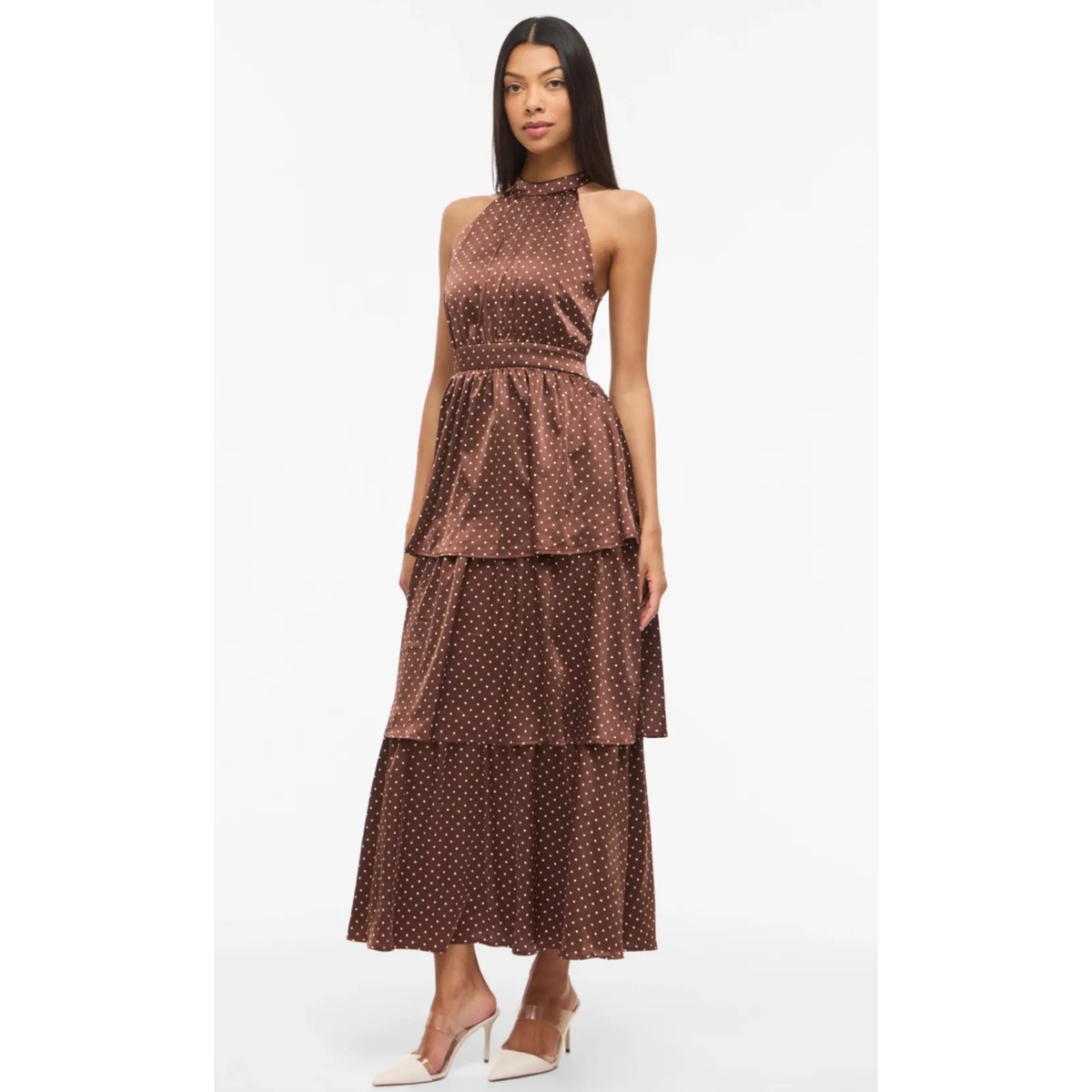 Brun satengkjole med prikker, halterneck og volanger på skjørtet.