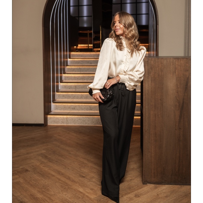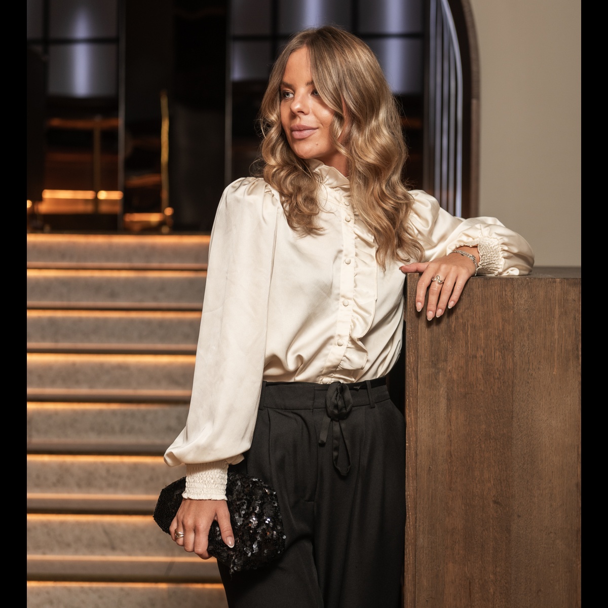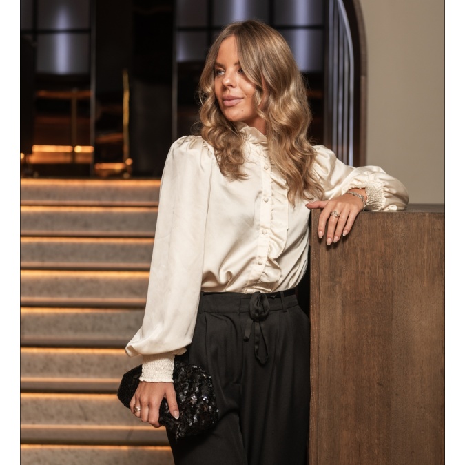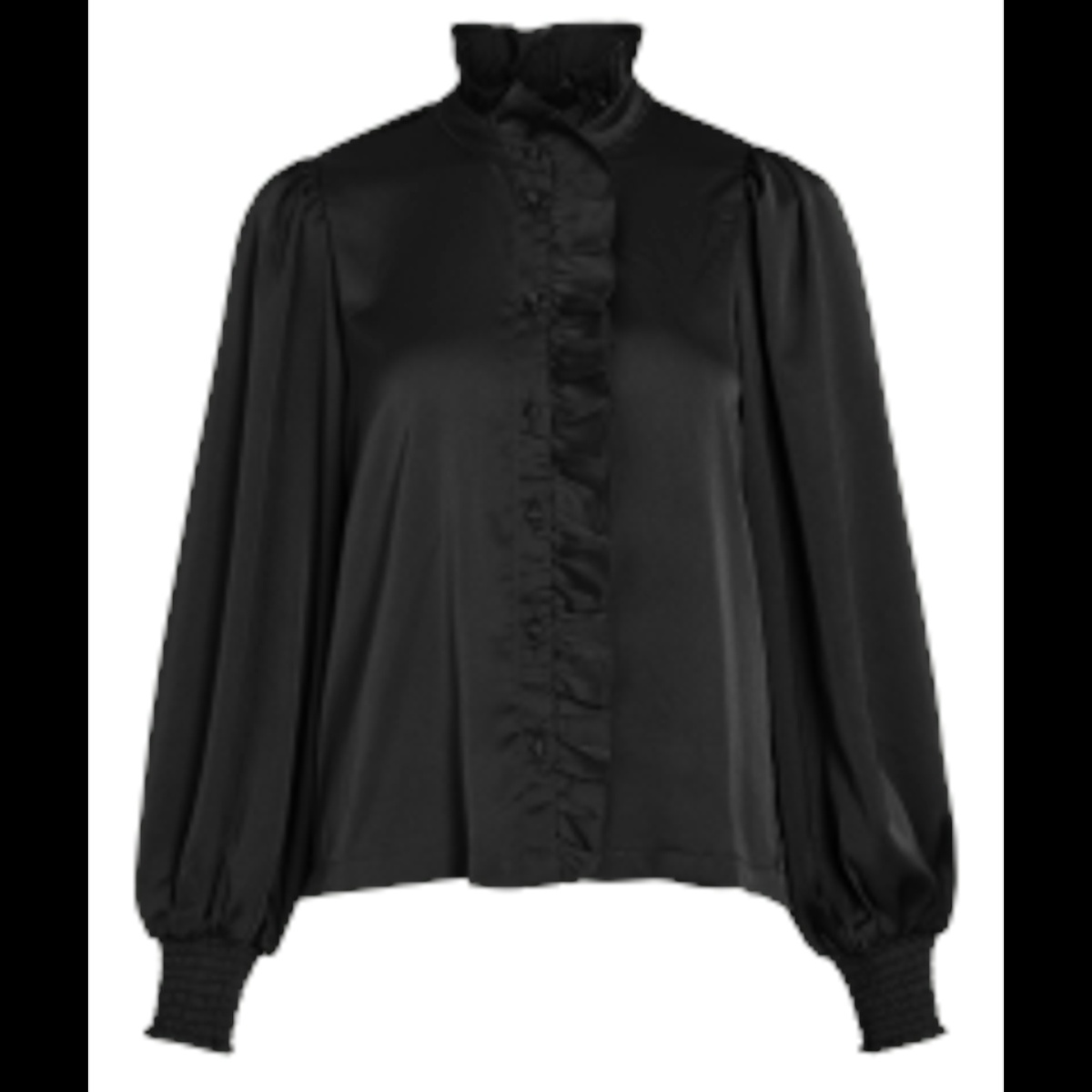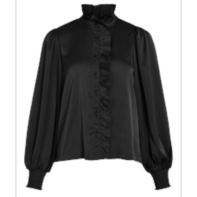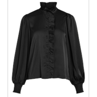 Lekker satengbluse med volanger på siden og høy mektig hals.