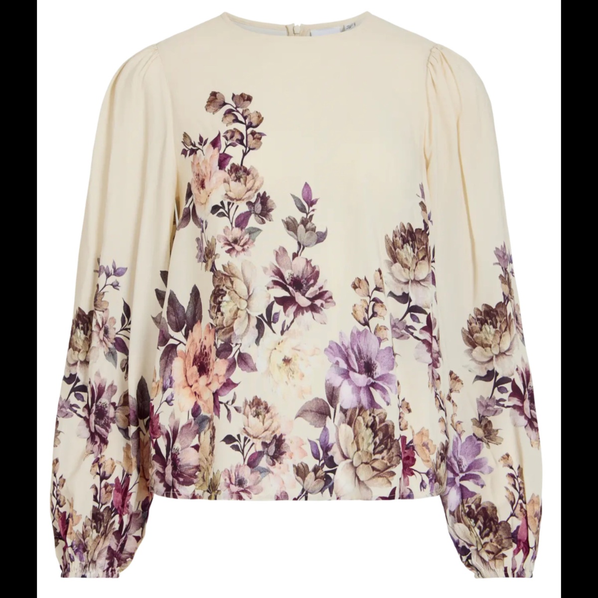 Bluse med nydelige farger, rund hals og strikk nederst på ermen.