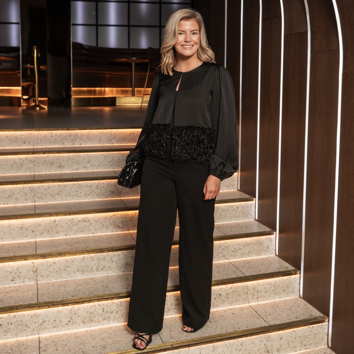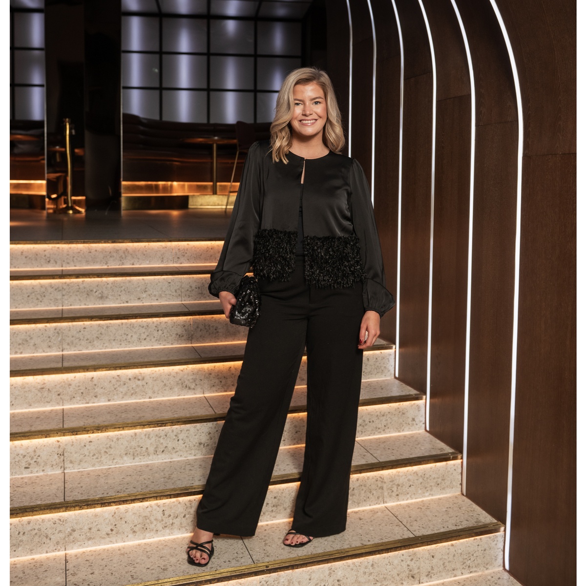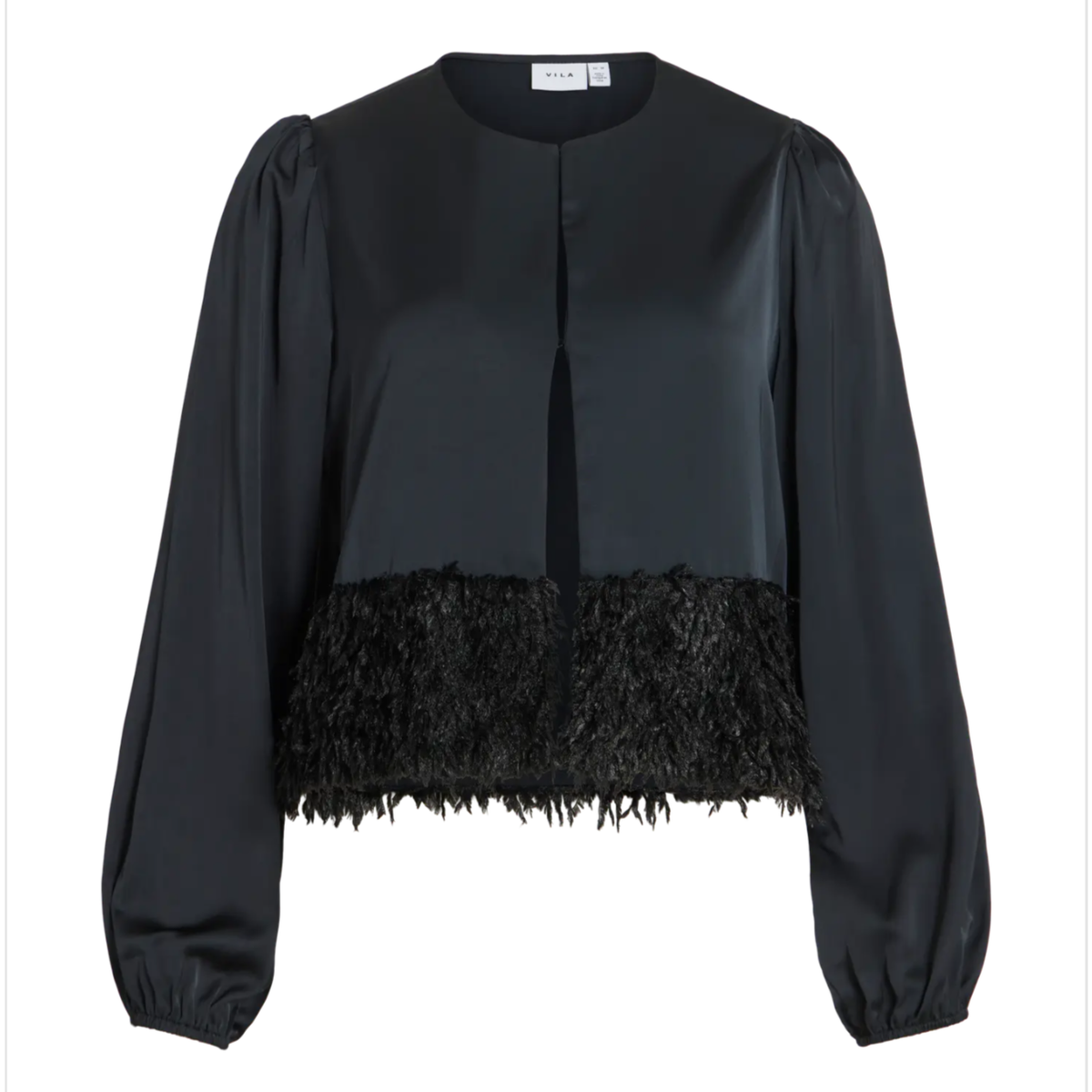 Satengjakke med hemper i front og lekker detalj nederst.