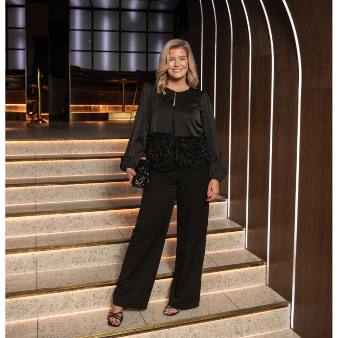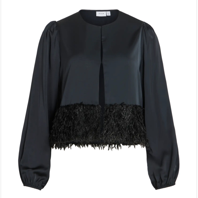 Satengjakke med hemper i front og lekker detalj nederst.