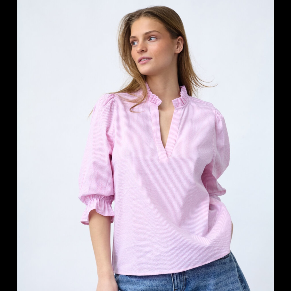 V hals, volanger i halsen og nederst på ermene.