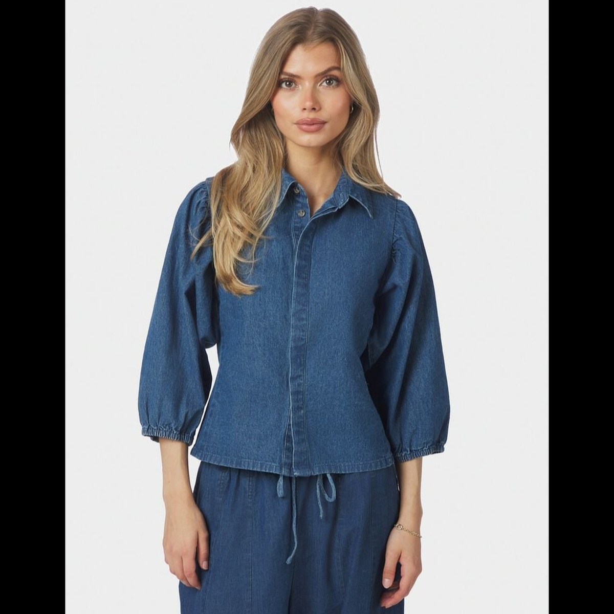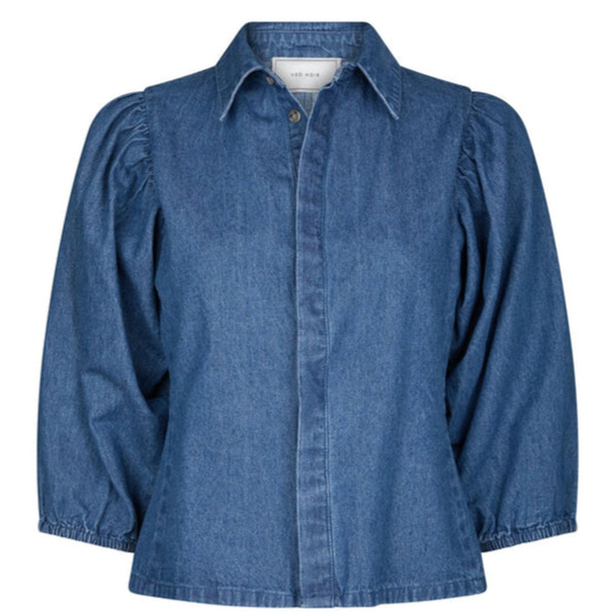 Feminin denimbluse med puffermer, klassisk krage og knappelukking.