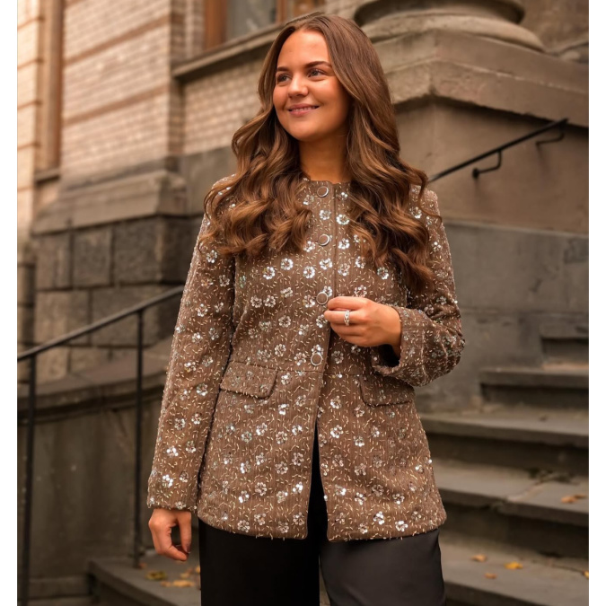 Små blomster lager av paljetter og lekre knapper ton i ton.