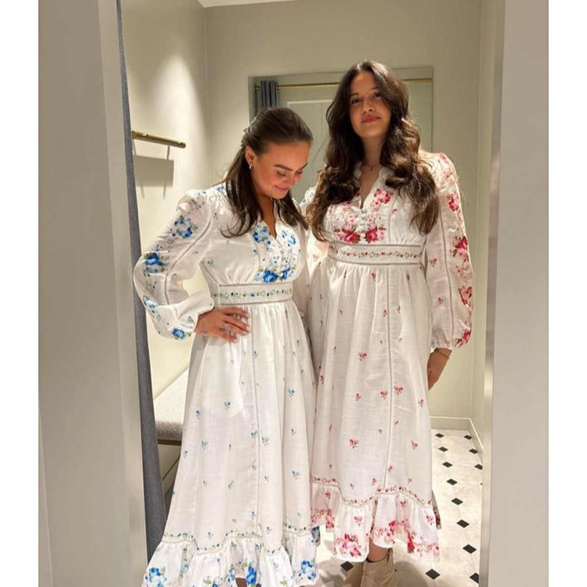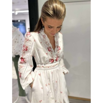 Nydelige broderier, detaljer i halsen og lommer.