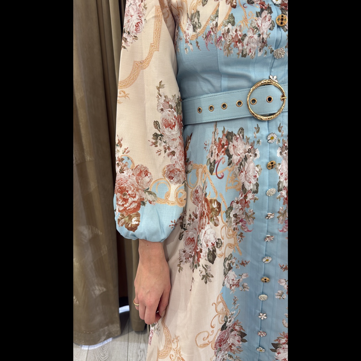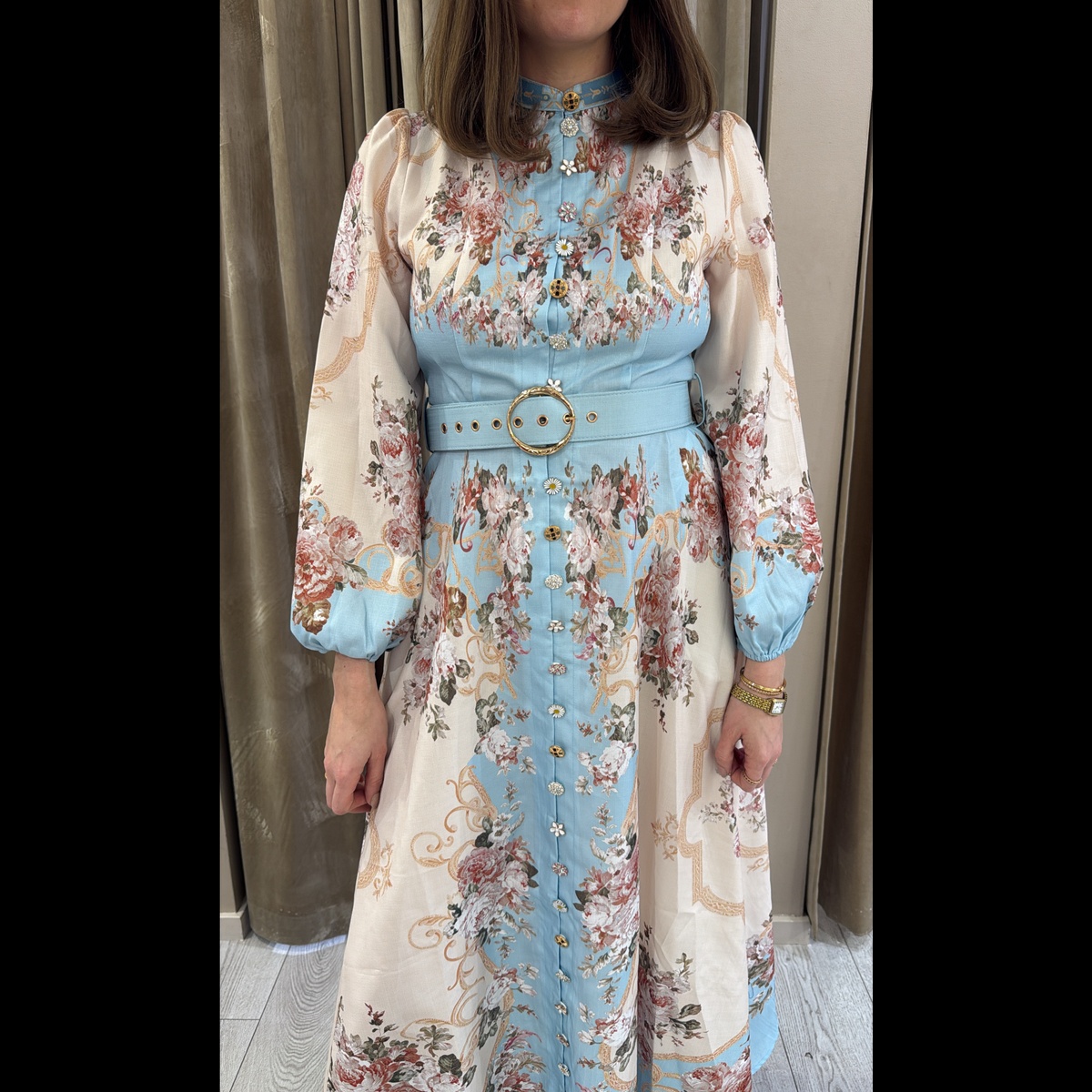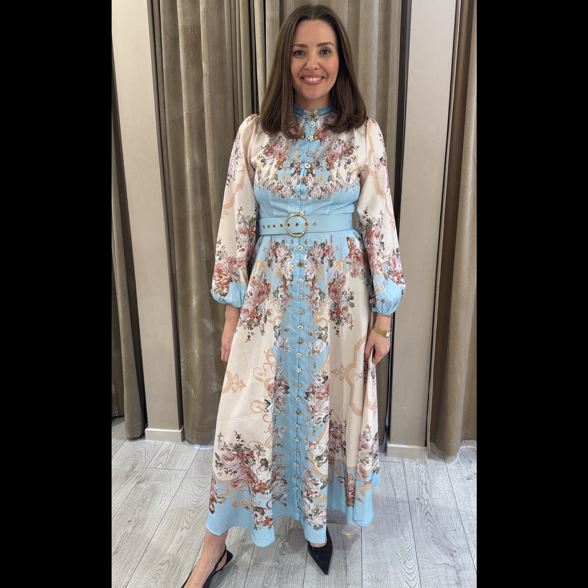 Lang kjole med vakre unike knapper hele veien i front, glidelås i ryggen.