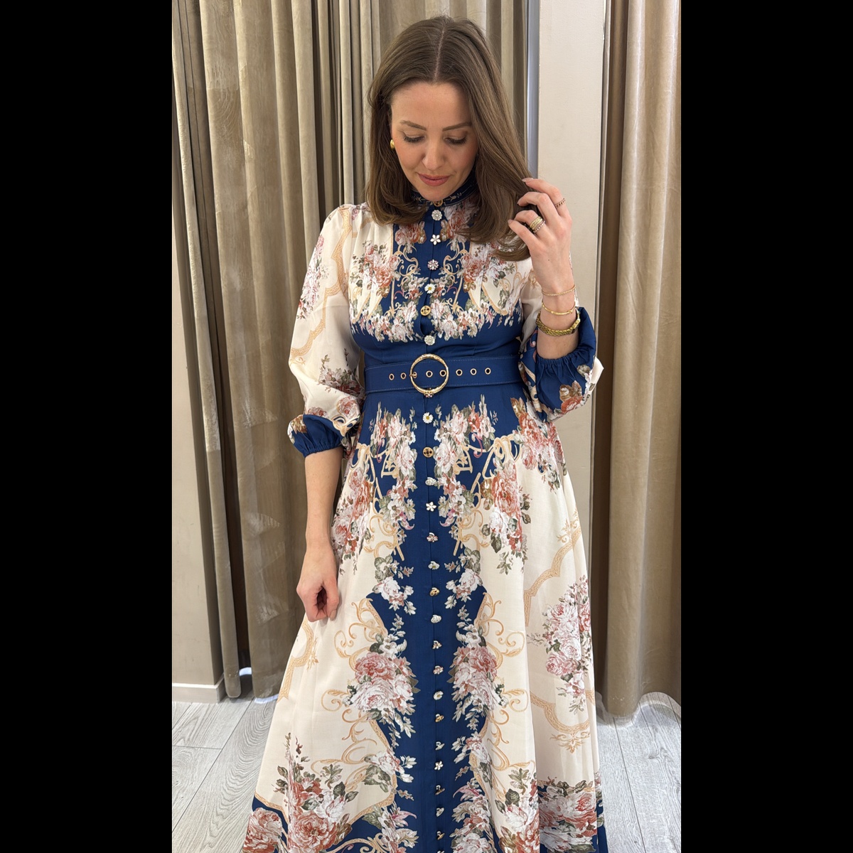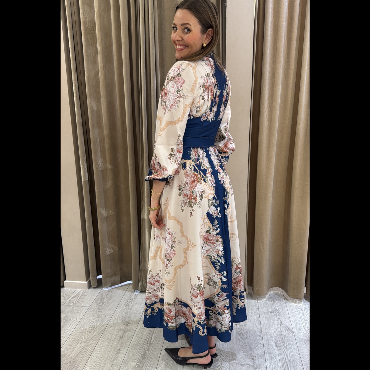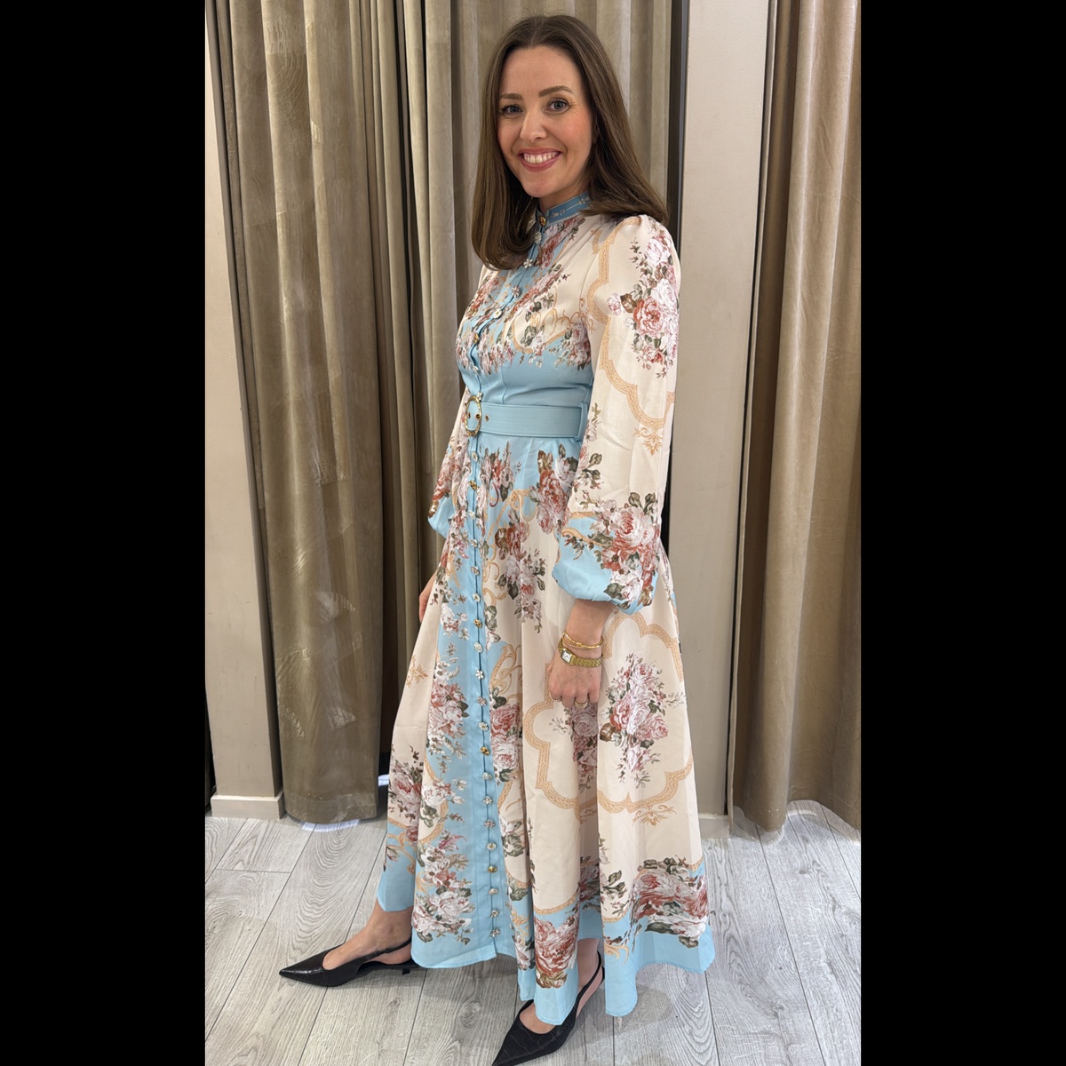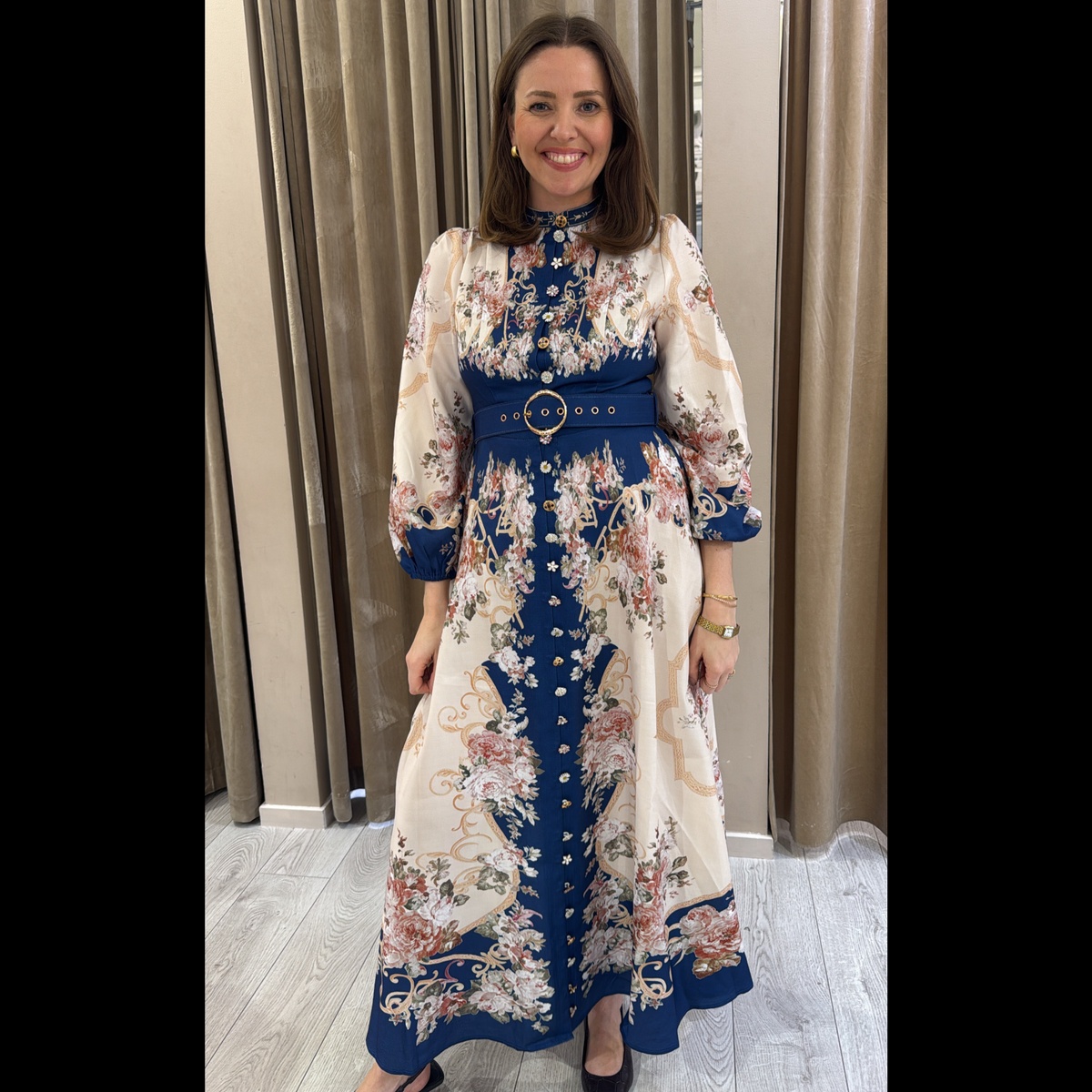 Lang kjole med vakre unike knapper hele veien i front, glidelås i ryggen.